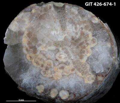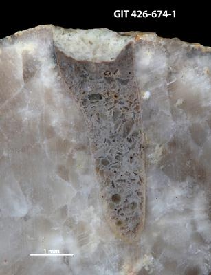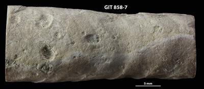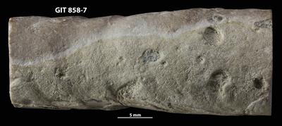 | Abstract | A steinkern of an endoceratid nautiloid siphuncle contains a Trypanites sozialis boring with a lingulate brachiopod Rowellella sp. shell inside. The steinkern of this endoceratid formed during early lithification of the sediment on the seafloor. The lithified steinkern of this siphuncle was either initially partially exposed to the seawater or was exhumed and stayed exposed on the seafloor, where it was colonized by boring organisms. This bioerosion resulted in numerous Trypanites borings in the siphuncle. After the death or exit of the Trypanites trace maker, a vacant boring was colonized by a small lingulate nestler Rowellella sp. This lingulate was likely preadapted to life in hard substrate borings when it first found its way into borings in living substrates in the Late Ordovician. The increased availability of hard substrate borings, combined with the increased predation pressure due to the GOBE, enhanced the colonization of hard substrate borings by lingulate brachiopods. |